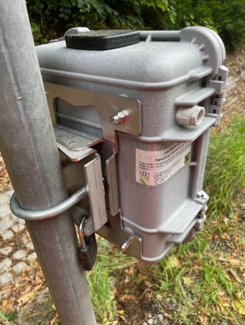 Die Seitenradarmessgeräte (siehe Foto) dürfen nicht entfernt oder verdreht werden. Befindet sich zeitweise Personal an den Zählstellen, wird um Unterstützung und Rücksichtnahme durch die Verkehrsteilnehmer gebeten.